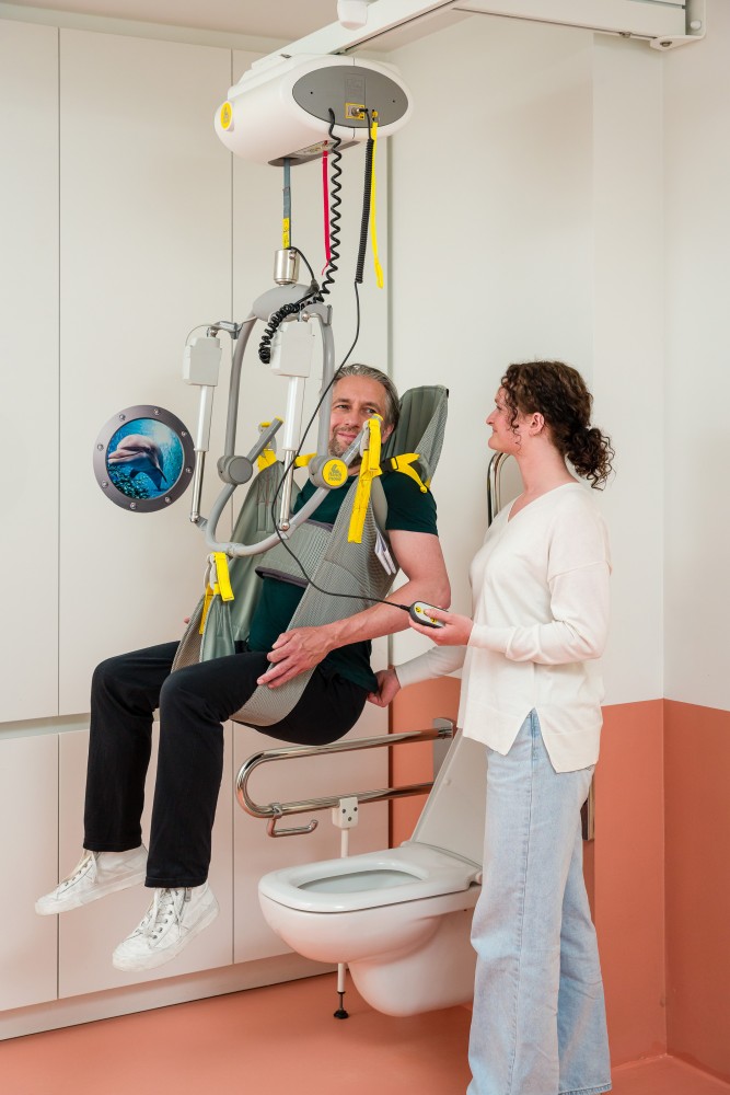 With the electric tilting spreaderbar and a lift, you can easily move from the wheelchair to the bed, bath, care table, and toilet.