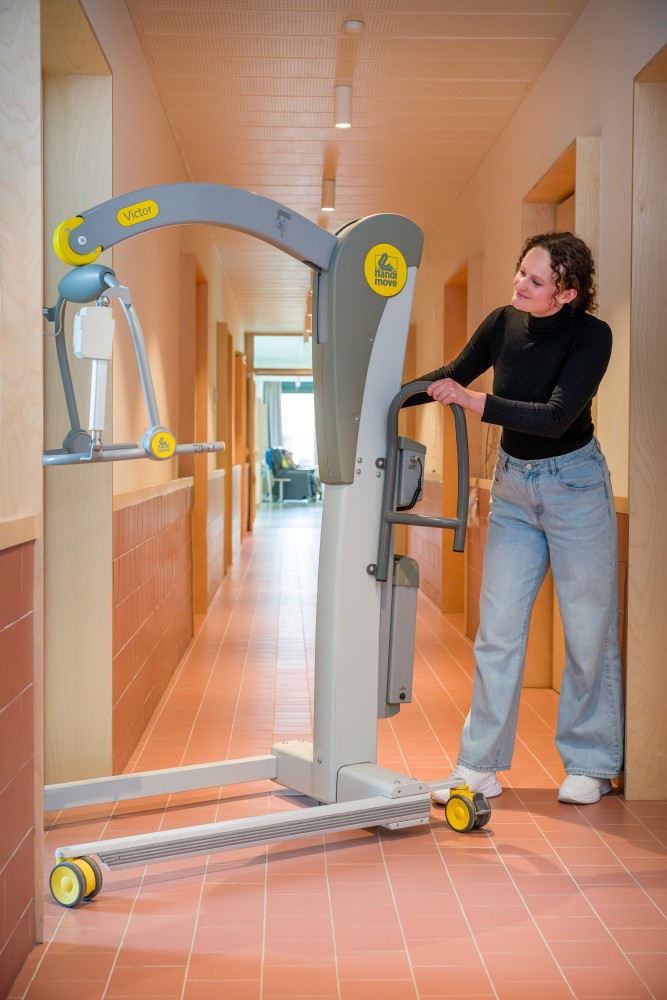 The Handi-Move "Victor" mobile lift is a mobile passive lift for intensive use in a professional environment. This device is designed for the fast, efficient, and frequent lifting of people with limited mobility in, for example, care facilities for people with disabilities, residential and care centers, hospitals, etc. The lift can be used flexibly in all situations.